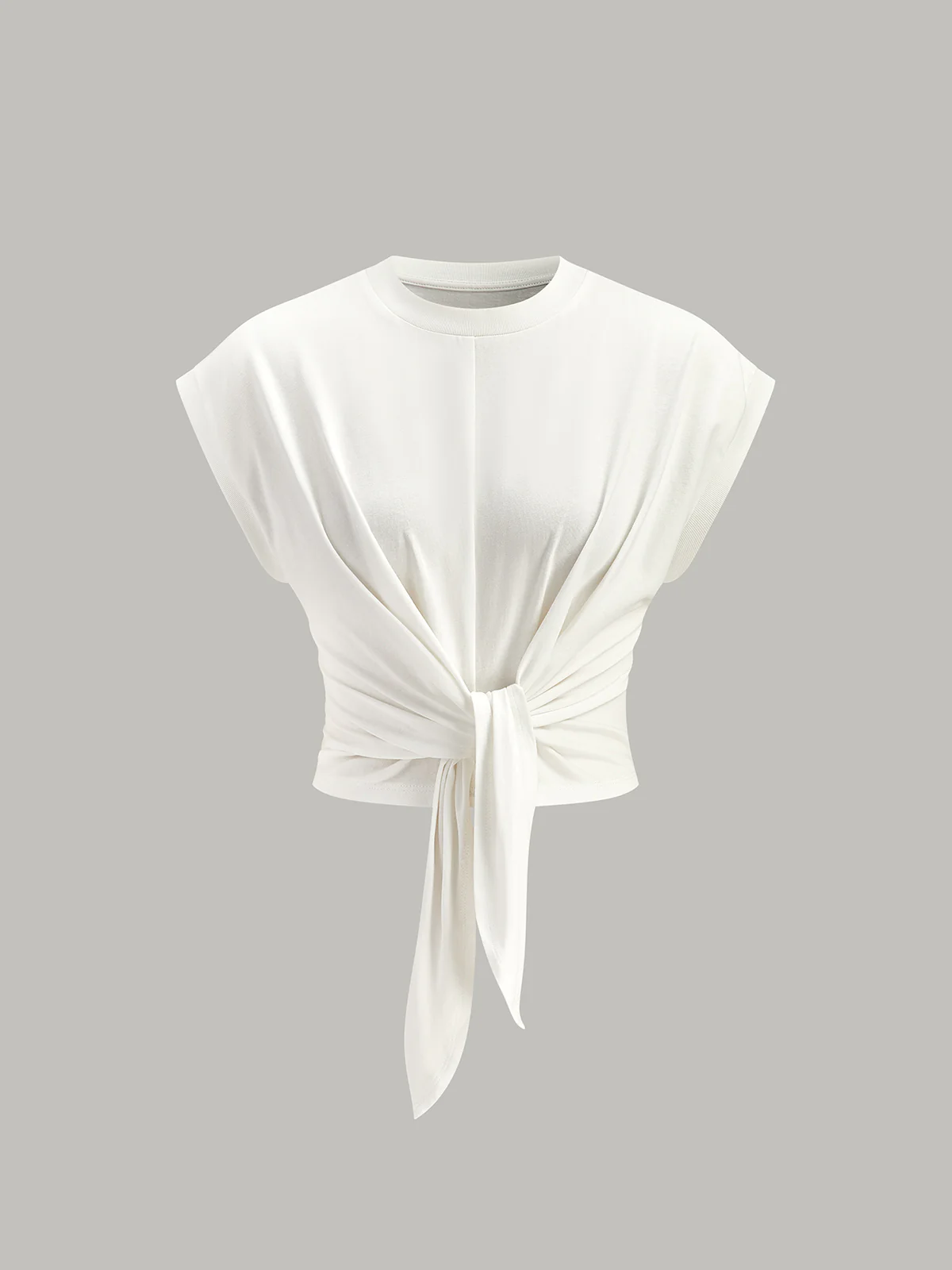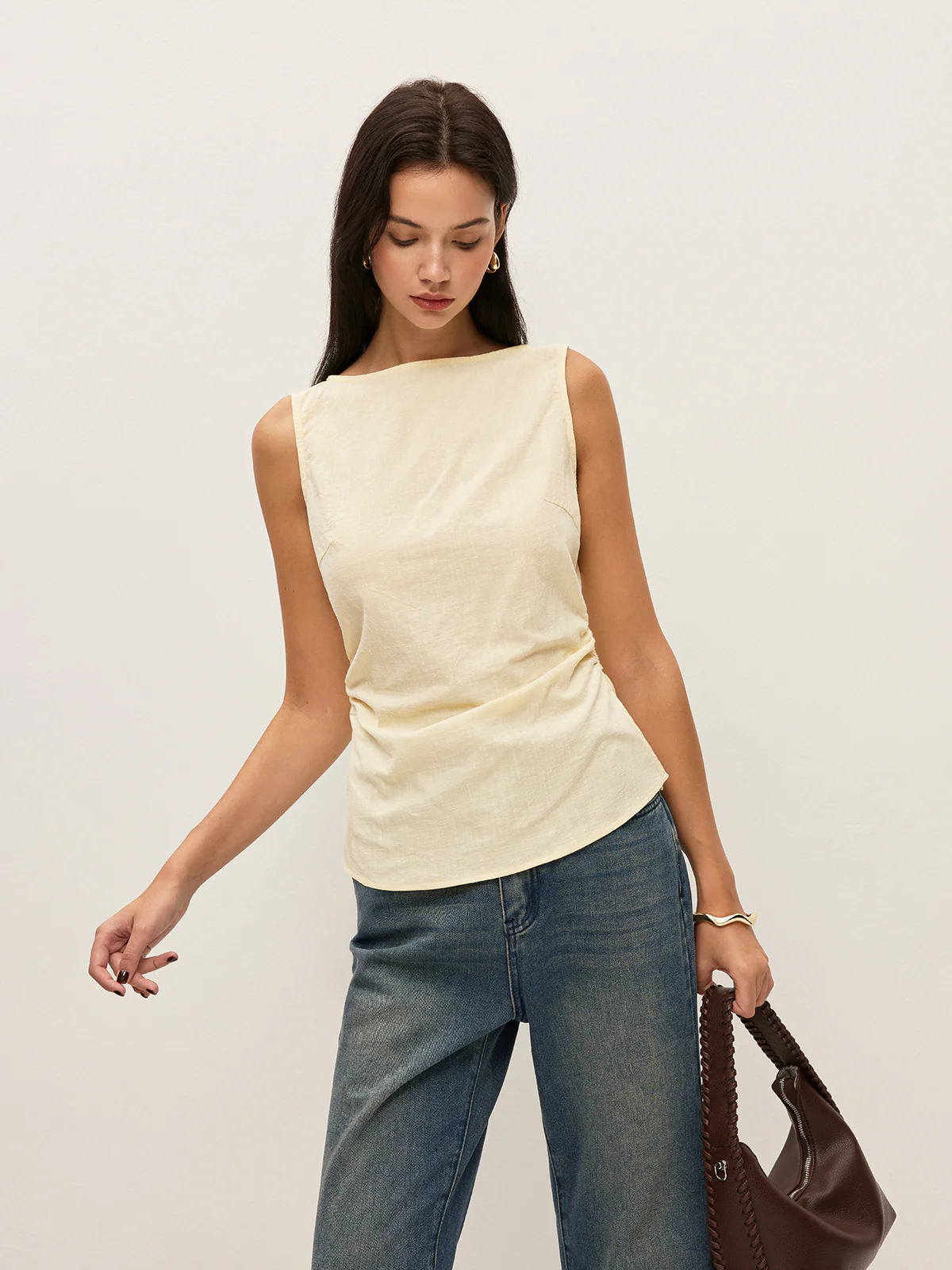 Cotton Solid Boat Neck Ruched Waist Sleeveless Blouse