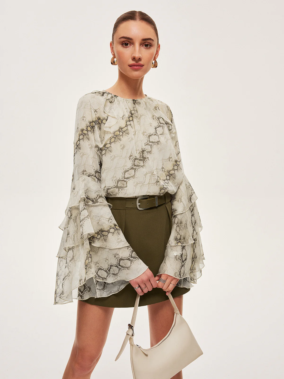 Semi-Sheer Print Ruffle Sleeve Chiffon Blouse