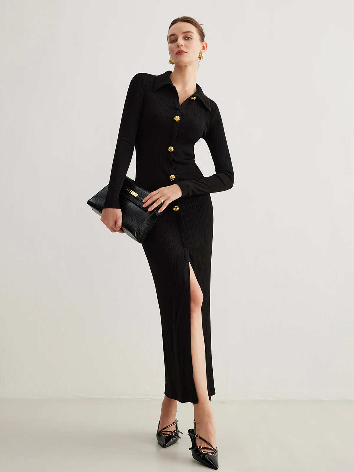 V-Neck Button Slim Long Dress