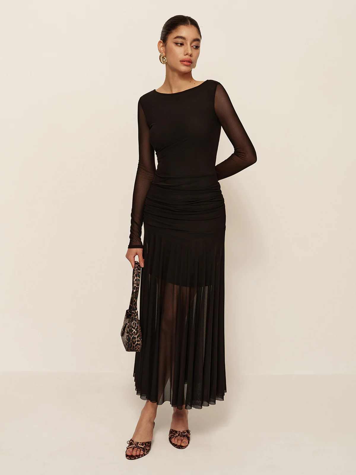 Sheer Pleated Hem Long Sleeve Ruched Dress