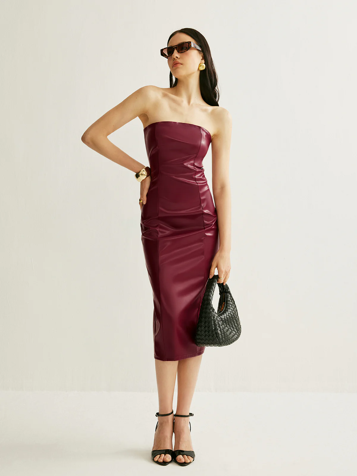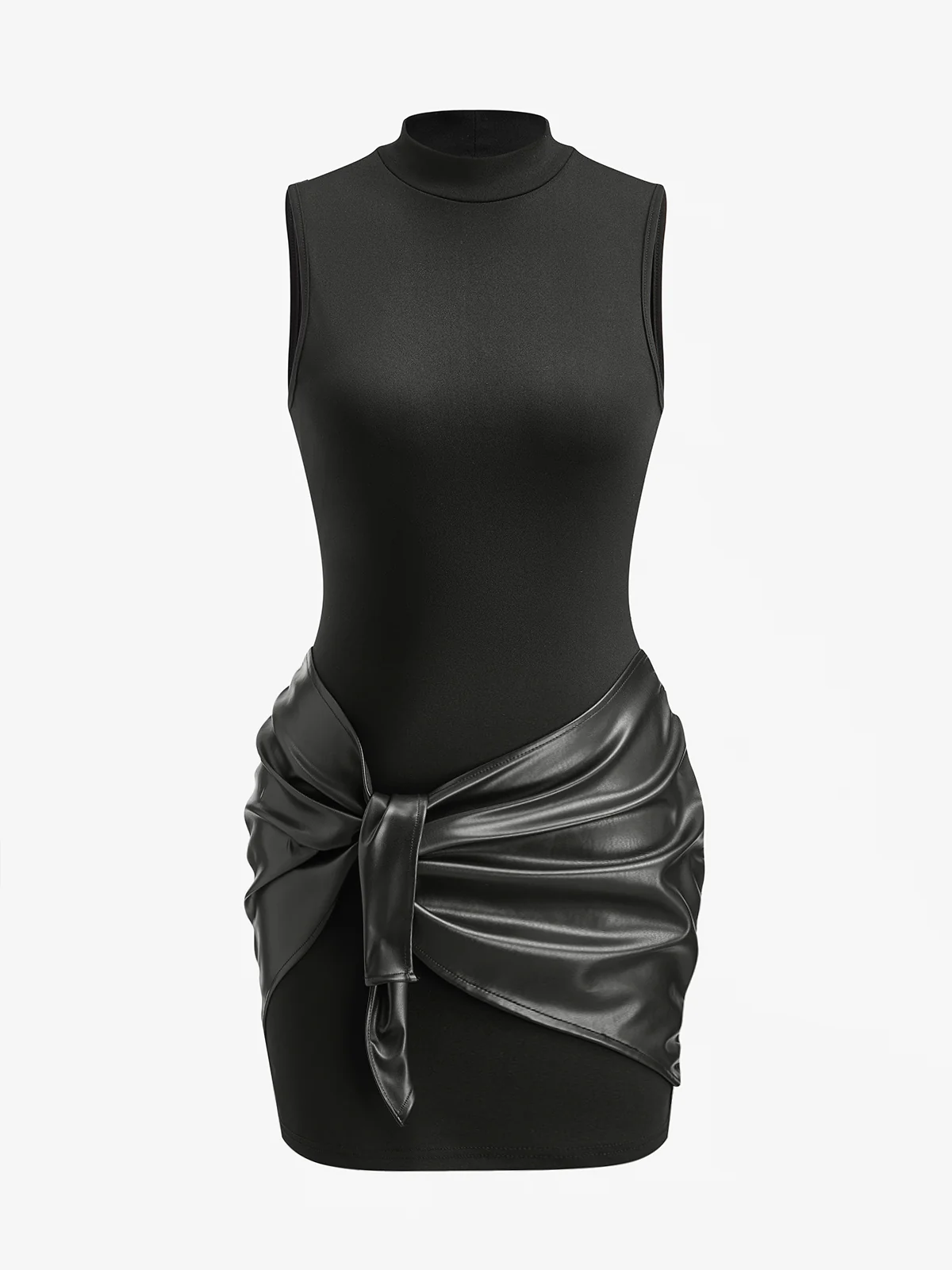 Keyhole Neckline Pleated PU Leather Slim Dress