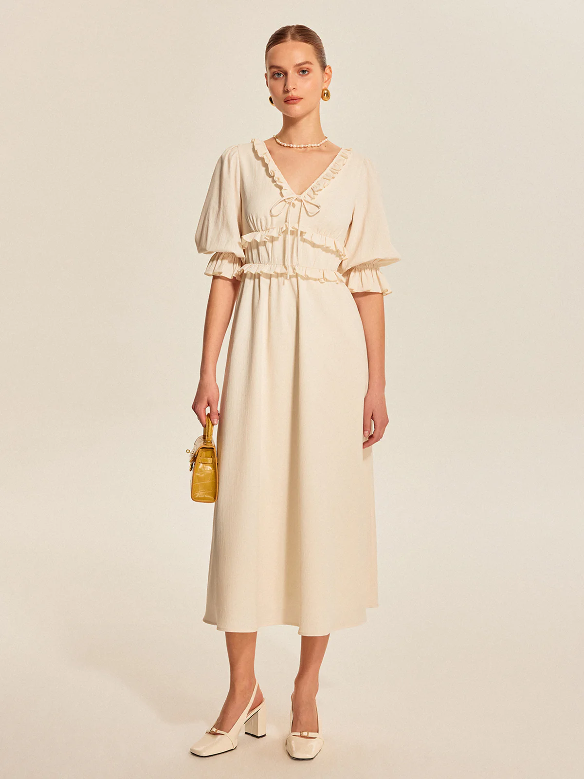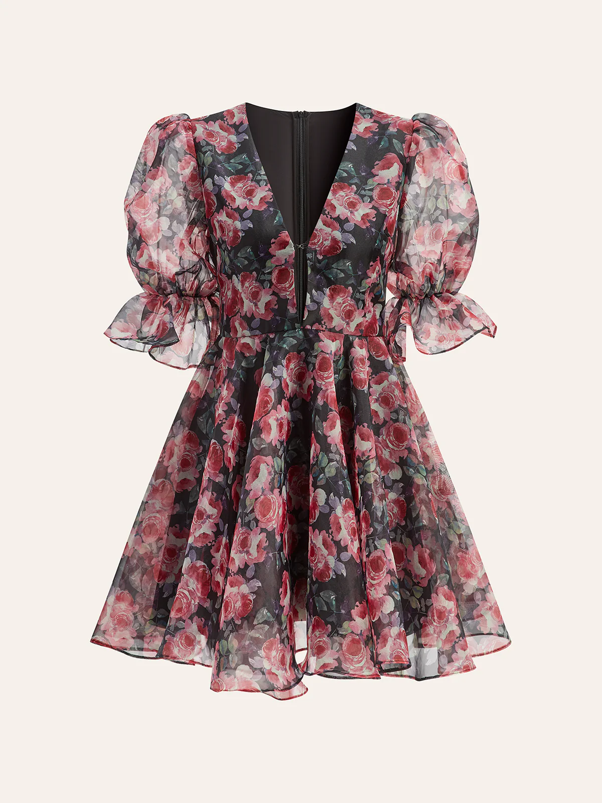 Cotton & Linen Puff Sleeve Floral Belted Dress