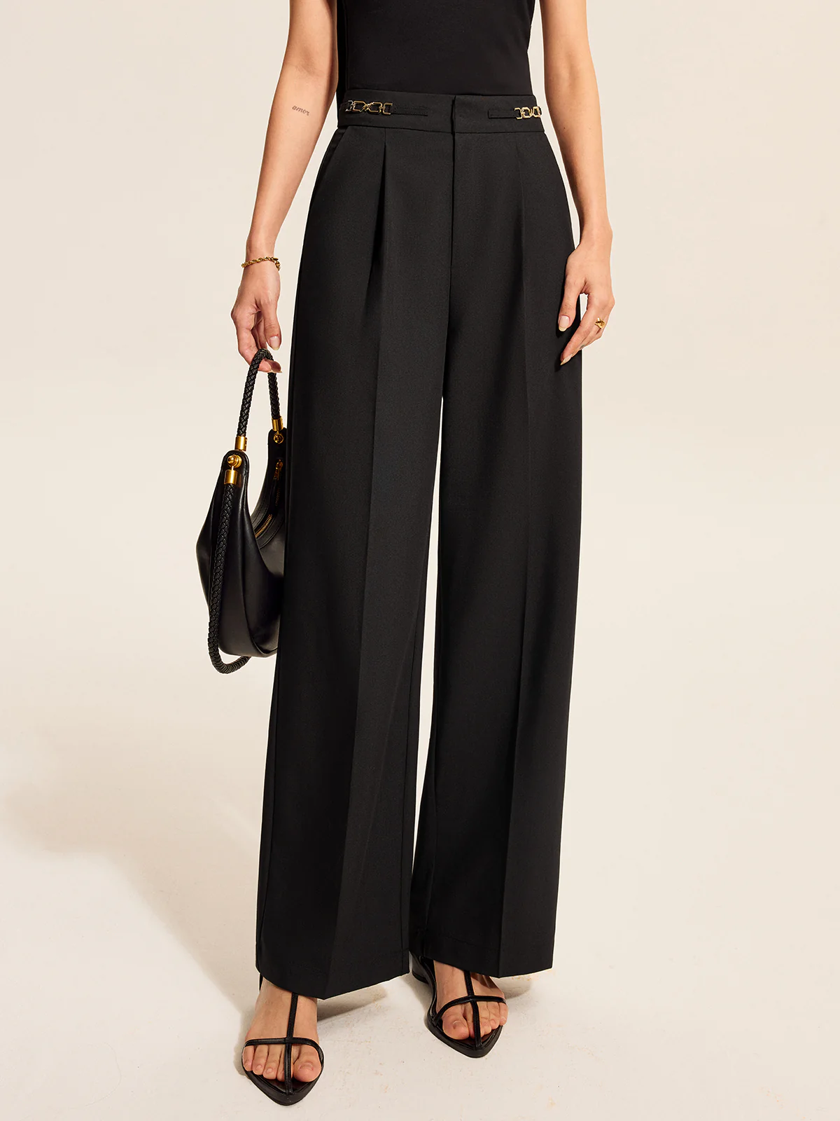 Mid-Waist Pleated Pants With Chain Detail