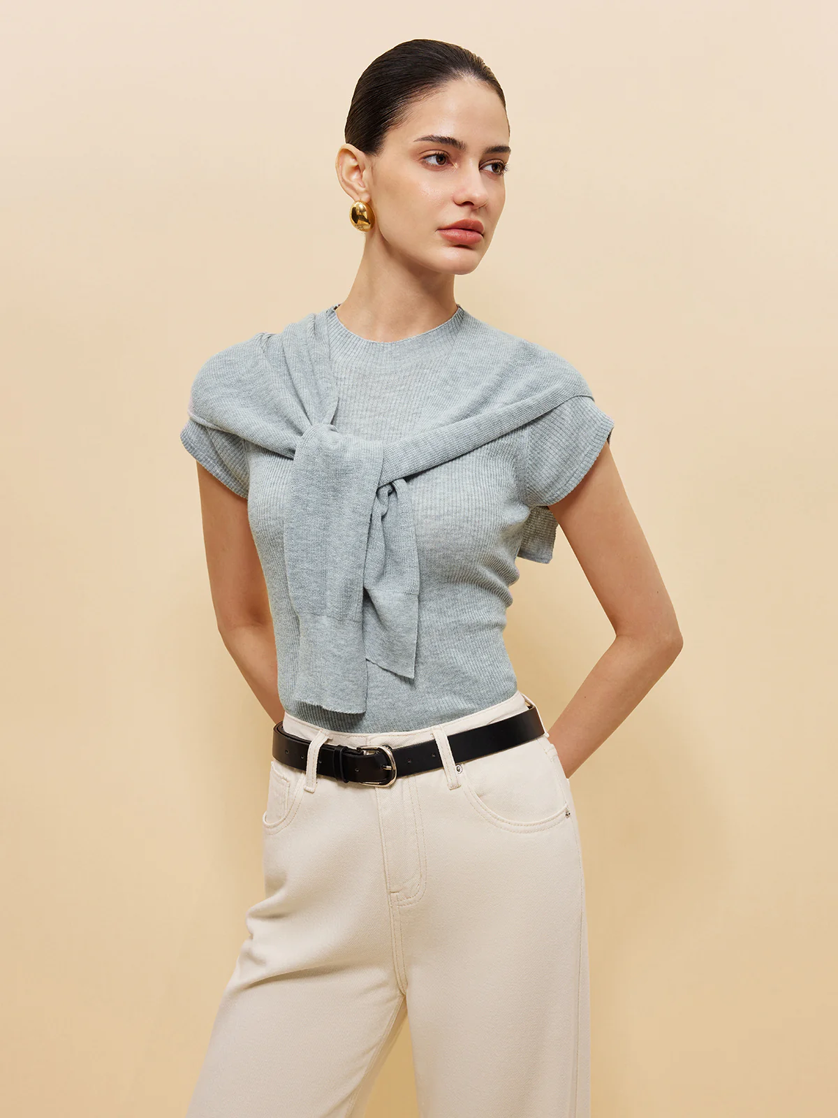 Wool-Blend Ribbed Knit Top With Tied Shawl Detail
