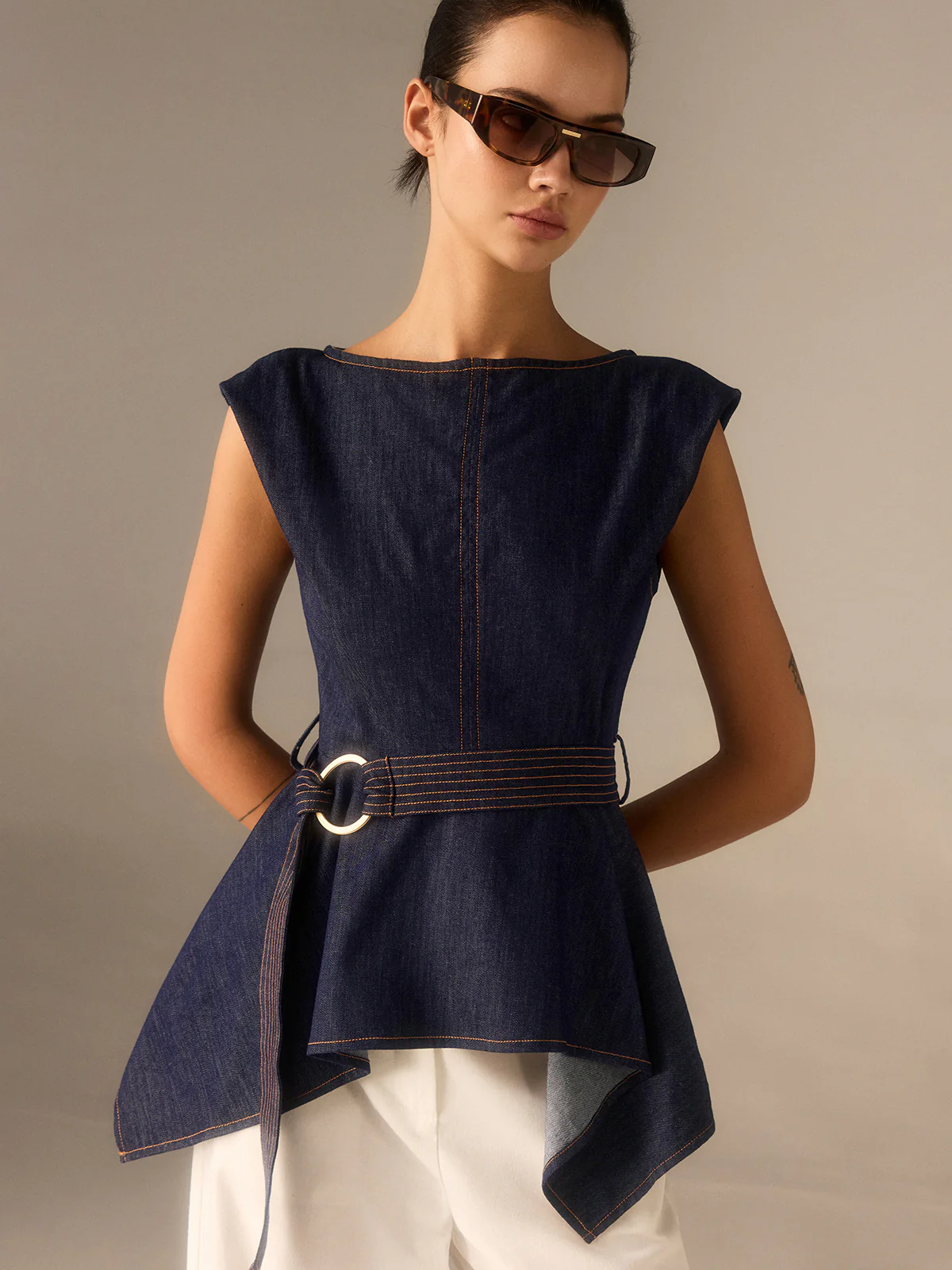 Denim Peplum Belted Top with Asymmetric Hem