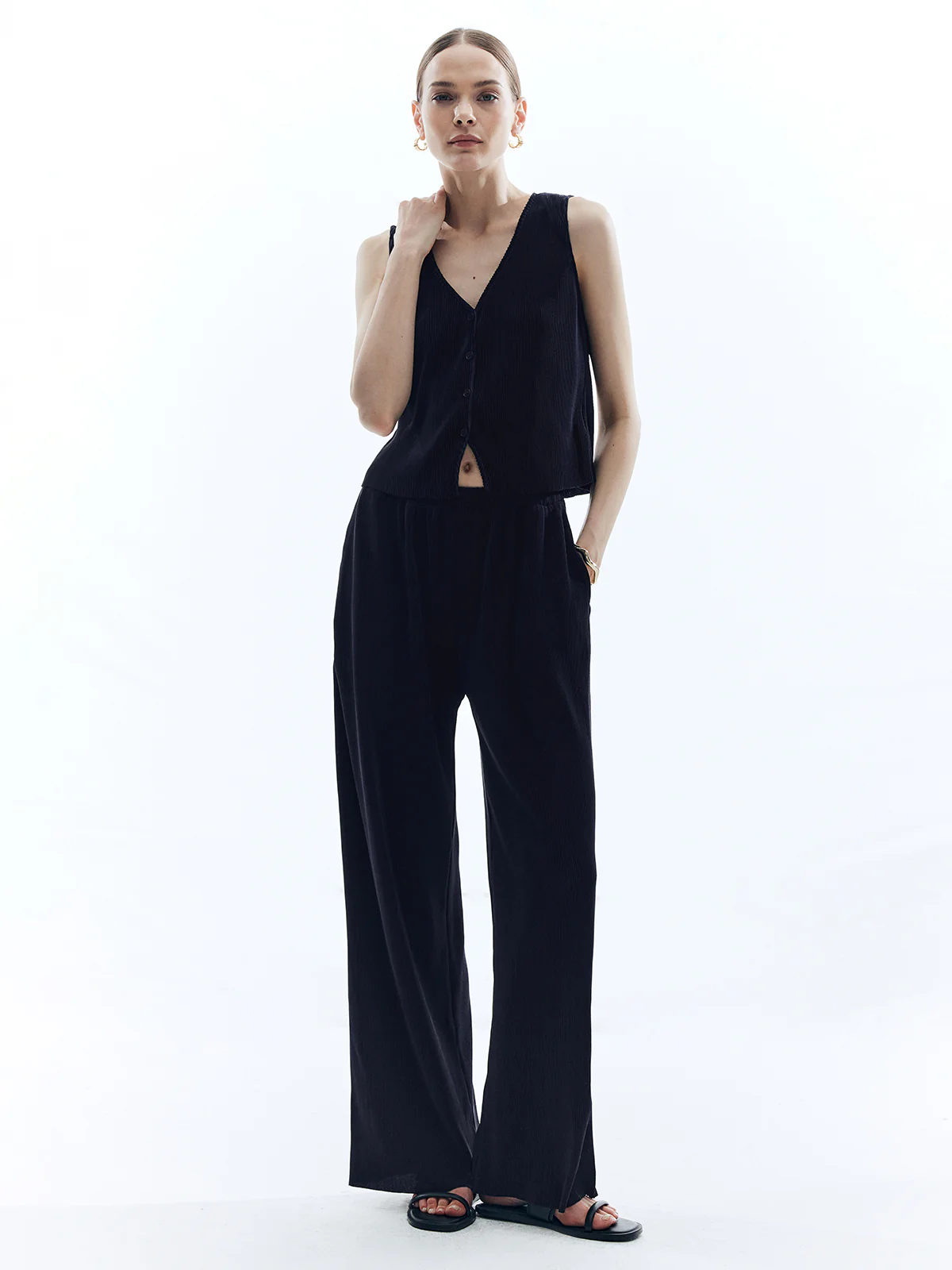 Satin Solid V-Neck Pants Set