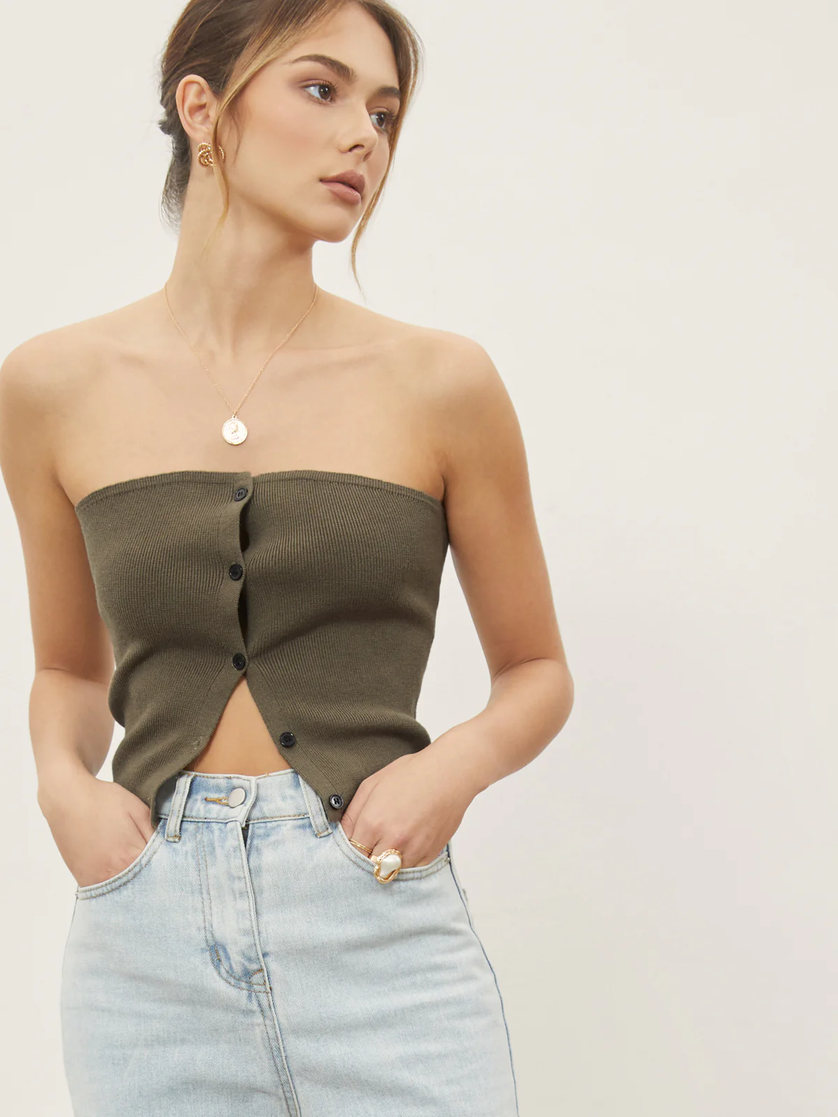 Button Down Knit Crop Strapeless Tube Top
