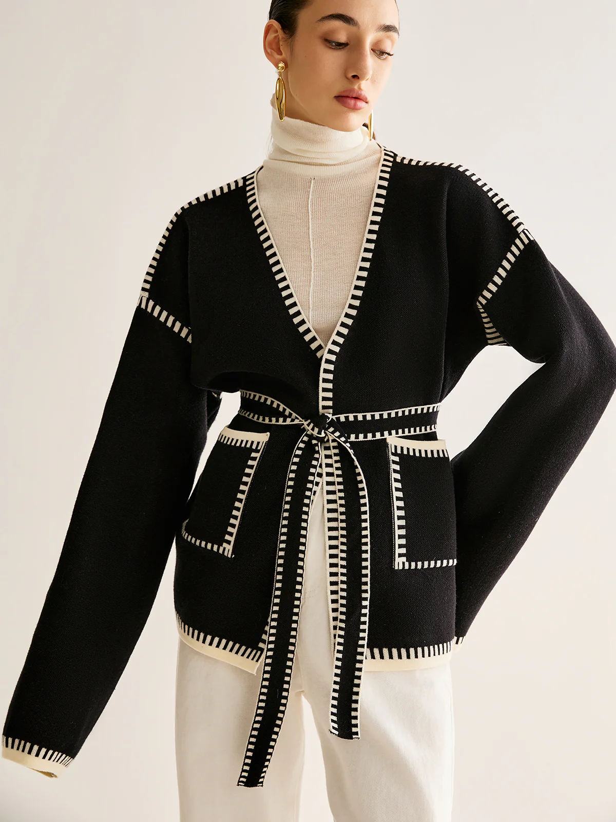 Contrast Binding Split Cardigan With Belt