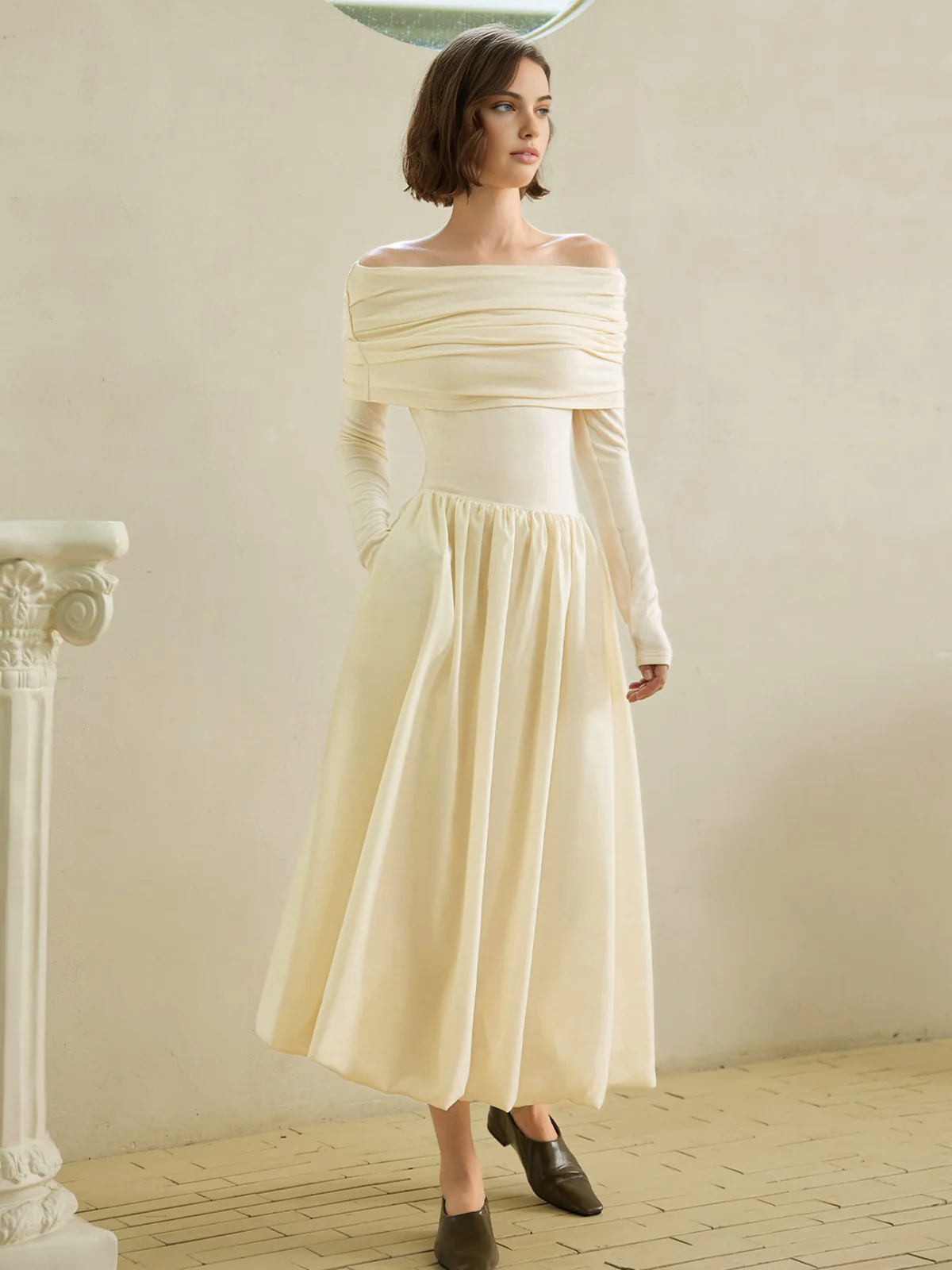 Off-Shoulder Bud Waist Pleated Knit Dress