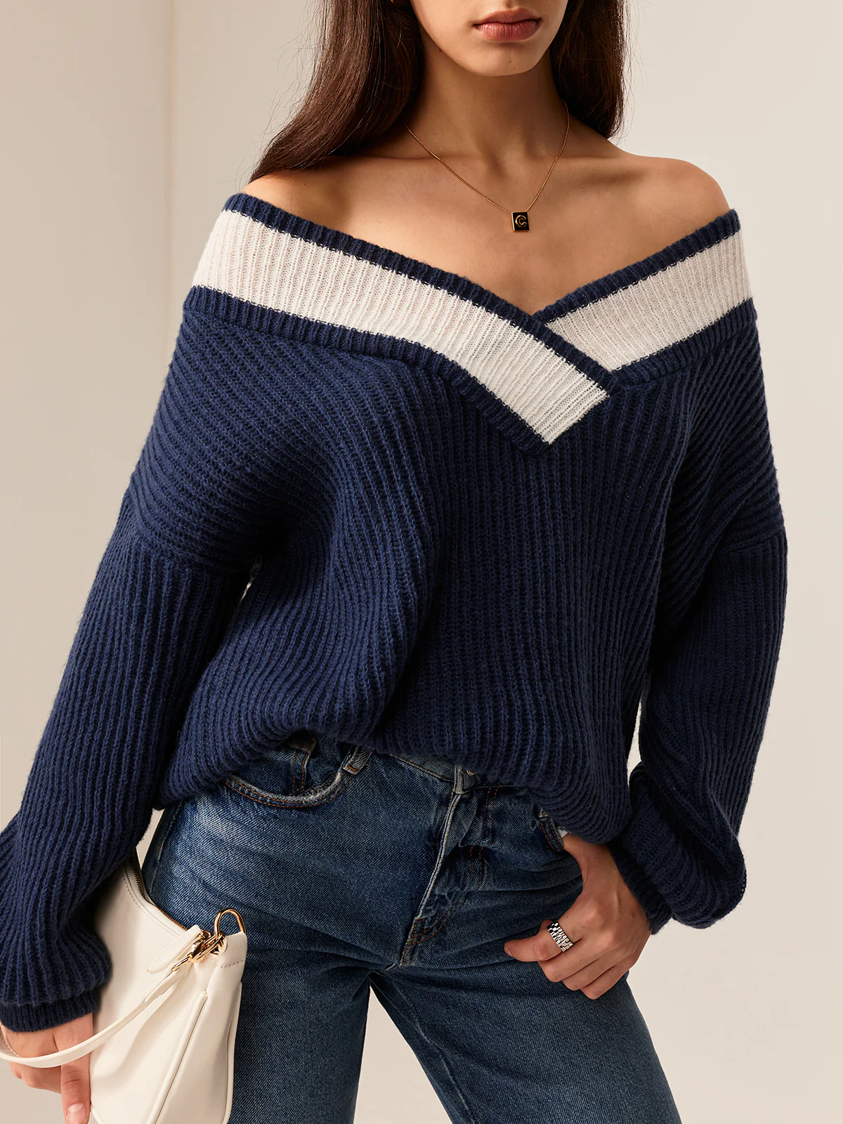 Contrast Binding Off-Shoulder Sweater